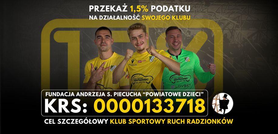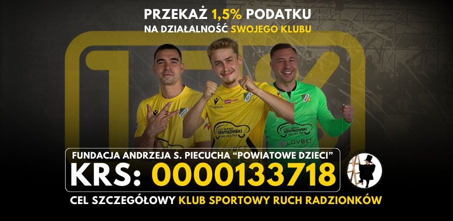 Dzięki współpracy nawiązanej z Fundacją Powiatowe Dzieci – OPP 1,5%, pojawiła się możliwość przekazania części swojego podatku na wsparcie działalności sportowej Klubu Sportowego Ruch Radzionków. To rozwiązanie pozwala na to, aby pieniądze, które i tak trafiają do systemu podatkowego, zasiliły konto Skarbu Naszego Miasta.